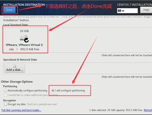 选择要安装的磁盘,并创建根分区(/)、交换分区和家目录分区。