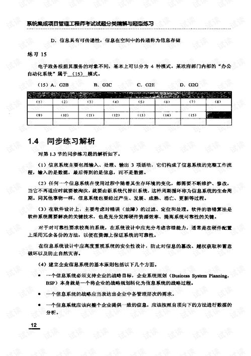 系统集成项目管理试题涵盖了项目管理的基本概念、原则、方法和工具,通过解析这些试题,有助于读者深入了解项目管理知识,提升项目管理能力。在实际工作中,项目经理需要将所学知识运用到项目中,以确保项目顺利进行。